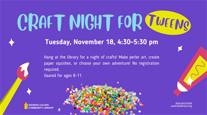 Hang at the library for a night of crafts! Make perler art, create paper squishes, or choose your own adventure! No registration required. Geared for ages 8-11.