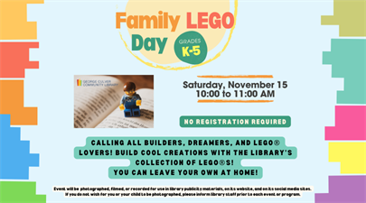 Calling all builders, dreamers, and LEGO® lovers! Build cool creations with the library's collection of LEGO®s! You can leave your own at home! Geared for grades K-5. No registration required.