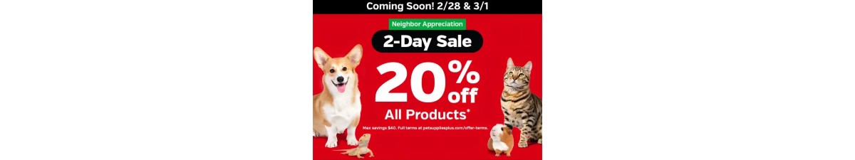 Enjoy 20% OFF all products* during this limited-time Neighbor Appreciation event. It’s the perfect opportunity to stock up on your pet’s favorite food, treats, toys, and essentials.