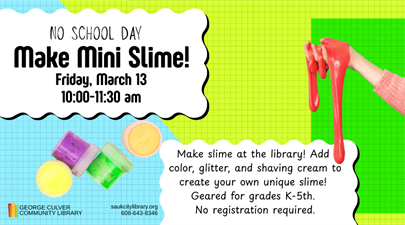 Make slime at the library! Add color, glitter, and shaving cream to create your own unique slime! Geared for grades K-5th. No registration required.