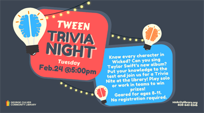 Know every character in Wicked? Can you sing Taylor Swift’s new album? Put your knowledge to the test and join us for a Trivia Nite at the library! Play solo or work in teams to win prizes! Geared for ages 8-11. No registration required.